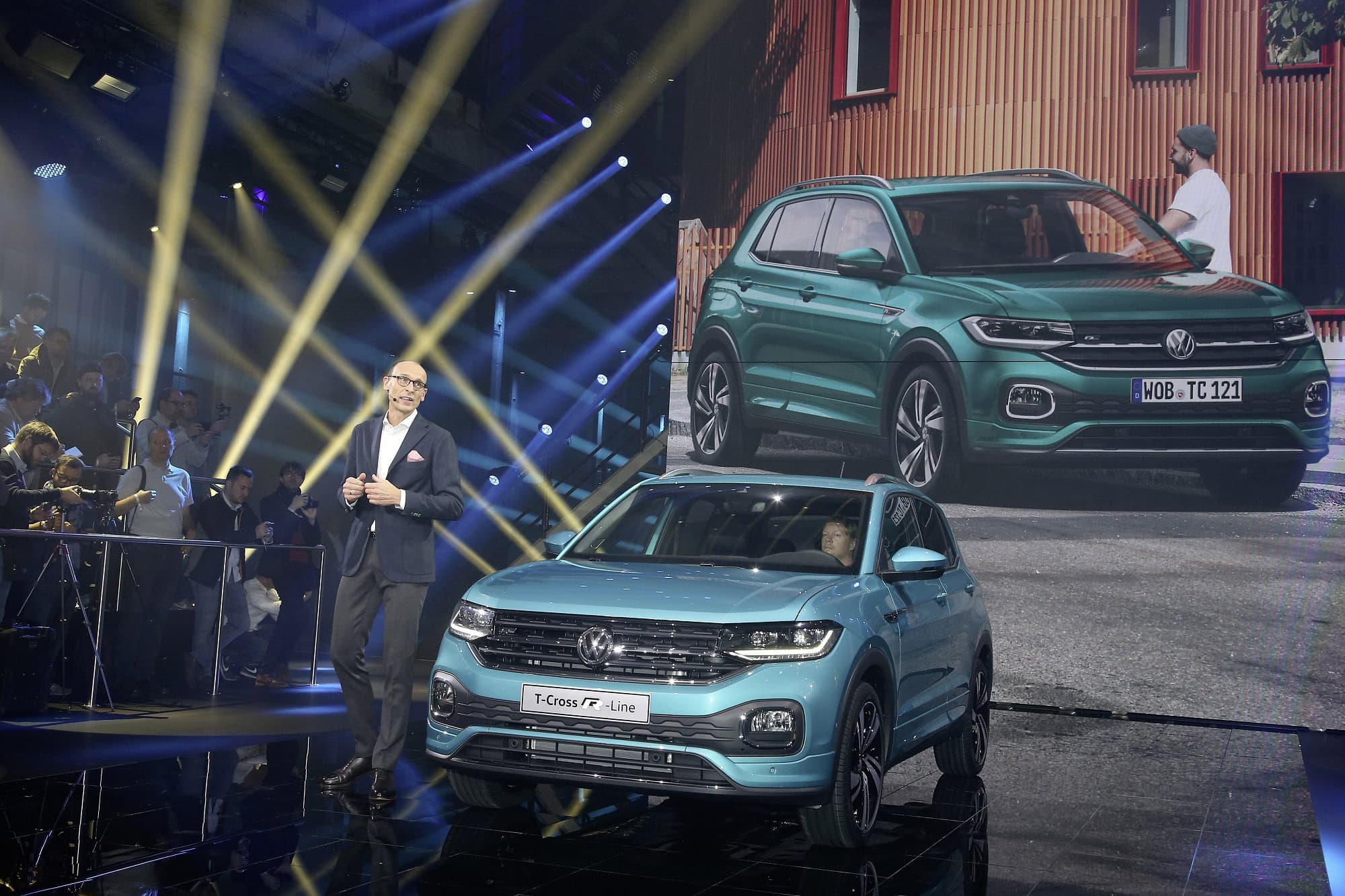 Dat Volkswagen voor deze lancering alles uit de kast trok, dat was de genodigden wel al duidelijk. Tijdens de lichtshow opende het bovenste gedeelte van de led-schermen zich, zodat het publiek het optreden van de drummers kon aanschouwen. Nu opende ook het onderste gedeelte van de schermen zich en kwamen Ralf Brandstätter (Chief Operating Officer Volkswagen Brand, Member of the Board of Management for Procurement Volkswagen brand), Klaus Bischoff (Head of Design Volkswagen Brand) en Andres Krüger (Head of Product Line Small) elk in een T-Cross de lichtstraat oprijden om vervolgens de nieuwe T-Cross te presenteren. Hun verhaal werd visueel ondersteund door projecties op de lichtstraat, bijvoorbeeld om de lane assist functionaliteit van de auto te demonstreren.