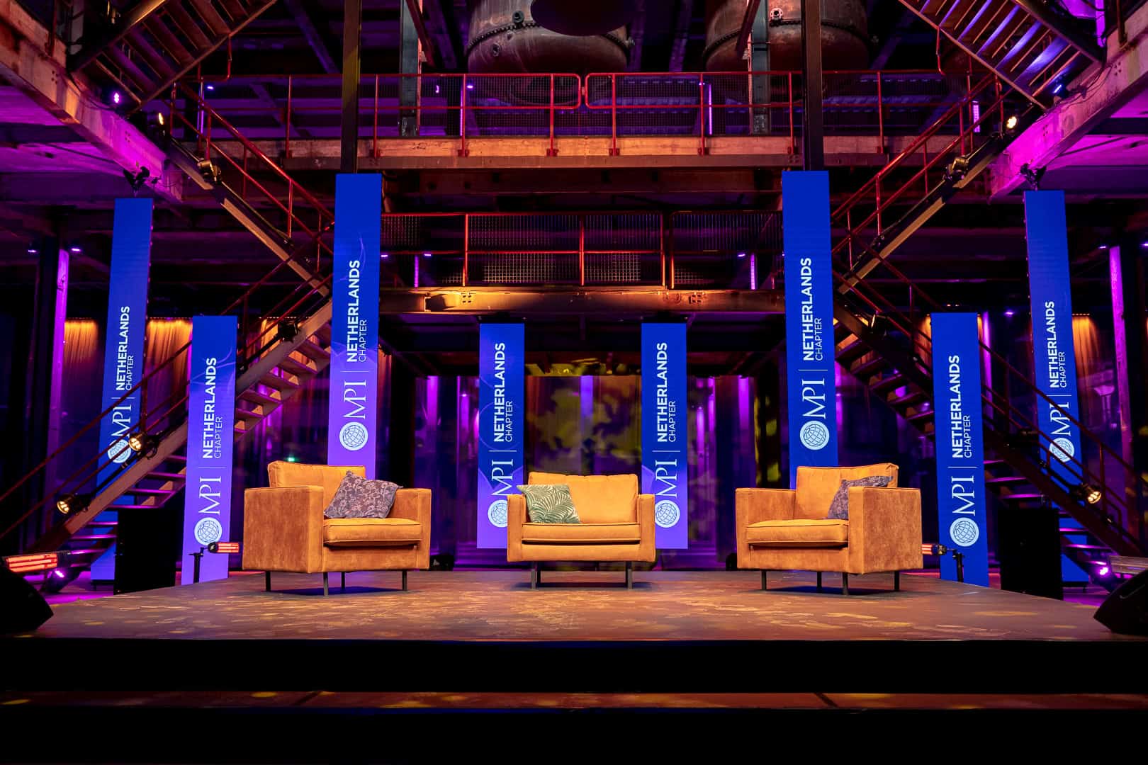 MPI Netherlands Chapter had gekozen voor een gave informele setting op het hoofdpodium met twee fauteuils. Daarnaast was er aan de zijkant van het hoofdpodium een extra setting gecreëerd voor de side kick positie. Zo konden ze tijdens het online event gemakkelijk schakelen van de ene naar de andere plek. Een multifunctionele opstelling in een ruim inzetbare ruimte.